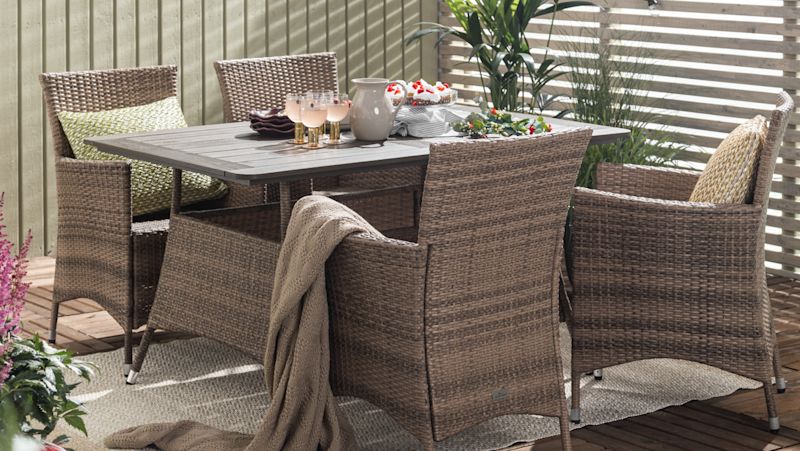 Möblerna är gjorda i tålig konstrotting och aluminium, och kommer med dynor som torkar snabbt om de blir blöta. Tygerna på dynorna är extra starka att de håller länge. Lägg till några fina utomhusmattor och belysning så blir det extra mysigt på kvällen.