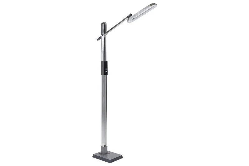 Modern LED-lampa med dimmer och touch-knapp. Gör ditt kontorsutrymme ljust och perfekt för olika uppgifter med denna LED-lampa. Den är tillverkad av slitstarkt syntetmaterial och aluminium och kommer att hålla i många år, även utan dagligt underhåll. Tack vare den behöver du aldrig mer oroa dig för att inte ha tillräckligt med ljus - lampan har 3 ljusfärger och dess arm och skärm kan justeras efter dina behov. Den är lätt att styra tack vare touchknapparna som sitter på en LCD-skärm som även visar aktuell tid, datum och temperatur. Lampan är stabil tack vare sin rektangulära bas. Den unika formen och den trendiga silverfärgen gör att detta tillbehör passar bra till moderna, industriella inredningar.