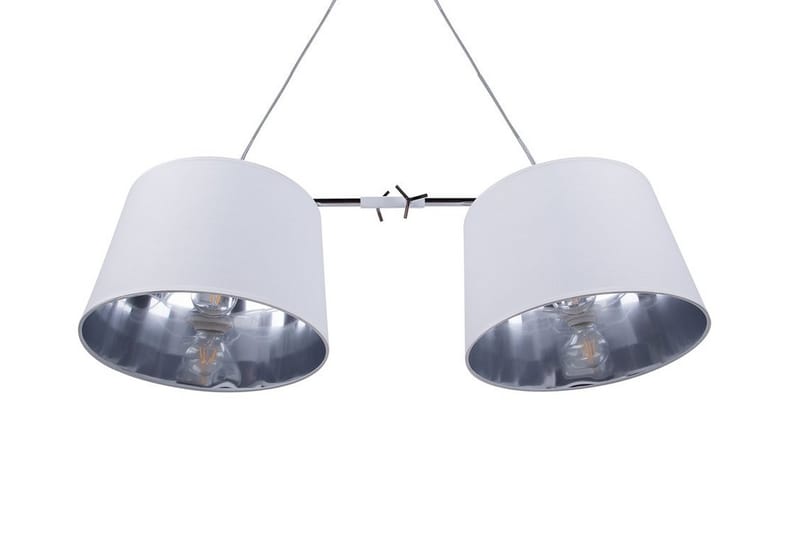Tidlös förkromad hänglampa i vitt. Denna pendlade arbetsbelysning kommer garanterat att bli ett blickfång ovanför matbordet eller köksön. Den består av två vita skärmar med kromfinish på insidan och hänger på en justerbar metallstång, vilket ger ett starkt, direkt ljus. Det är en utmärkt accentlampa som ger en retrokänsla till alla moderna hemmiljöer.