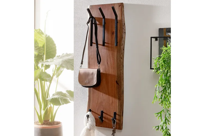 design Uttrycksfull klädhängare i trä och metall Väggklädhängare med sex krokar Klädhängare i äkta trä med naturlig träkant Dimensioner Bredd: ca 35,5 cm Höjd: 100 cm Djup: 11 cm Materialtjocklek trä: 2,5 cm Materialtjocklek metall: 1,5 cm Ytterligare dimensioner finns i dimensionsritningen färg Bakvägg: brun Krok: svart särskildheter Sex massiva krokar på två olika höjder Naturlig träkant för en individuell design Varje klädhängare är kärleksfullt handgjord och är därför helt unik På grund av den använda naturprodukten kan det finnas små avvikelser i färg och dimensioner Rekommenderad maximal belastningskapacitet: 6 kg material Bakvägg: massiv akacia trä, belagd med klar lack Krok: Pulverlackerat järn leverans En väggklädhängare utan dekoration Monteringsmaterial för väggmontering ingår inte i leveransomfattningen, eftersom detta beror på väggens natur Montering Leveransstatus: fullt monterad och säkert förpackad Skötselråd Torka med en fuktig trasa, eventuellt med ett milt rengöringsmedel, torka sedan med en torr trasa - använd inte starka eller lösningsbaserade rengöringsmedel.