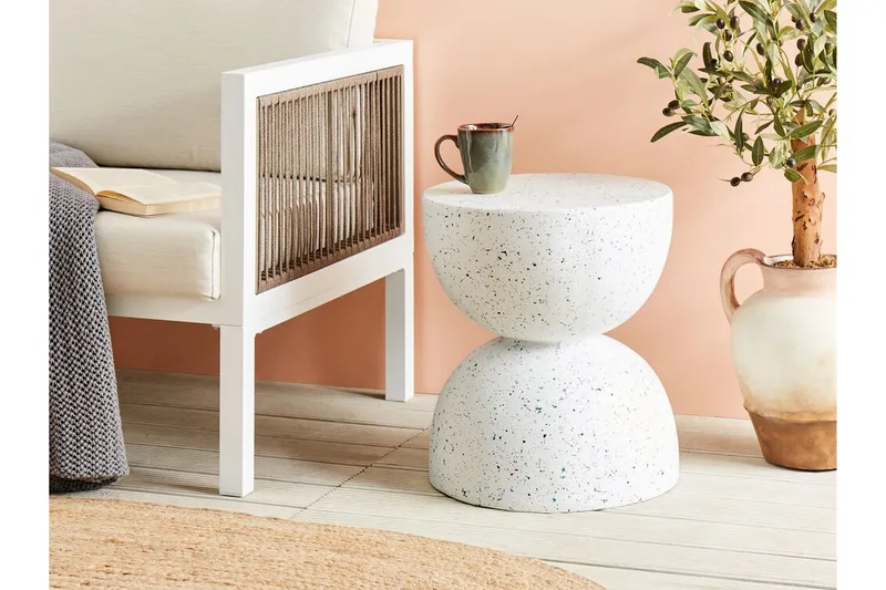 Timglasformat sidobord för utomhusbruk. Lyft din interiör eller trädgård med detta exceptionella sidobord, perfekt för både inomhus- och utomhusbruk. Tillverkat av väderbeständiga material, garanterar det hållbarhet och långvarig skönhet i alla miljöer. Det dekorativa terrazzomönstret ger en trendig och sofistikerad touch till din inredning, medan dess enkla och eleganta design g ör det till ett charmigt komplement till vilket rum som helst. Bordets lätta vikt och mångsidighet gör det enkelt att flytta och placera där det behövs mest, vilket gör det till ett praktiskt och stilfullt tillskott till ditt hem eller trädgård.