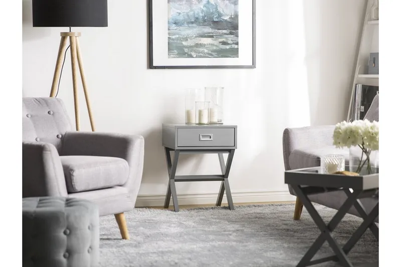 Grått sängbord med förvaringsutrymme. Detta eleganta sidobord är ett perfekt val om du söker en möbel som både är funktionell och snygg. Bordet har en rektangulär bordsskiva i målad MDF och korslagda ben i furu, vilket ger en stilren och modern känsla. Det kromade handtaget står i fin kontrast mot den vita lacken och ger en extra touch av elegans. Med en rymlig låda kan du enkelt förvara dina saker och hålla ytan fri från stök. Dess diskreta, moderna design gör att bordet smälter in sömlöst i olika inredningsstilar, särskilt i moderna och minimalistiska miljöer.