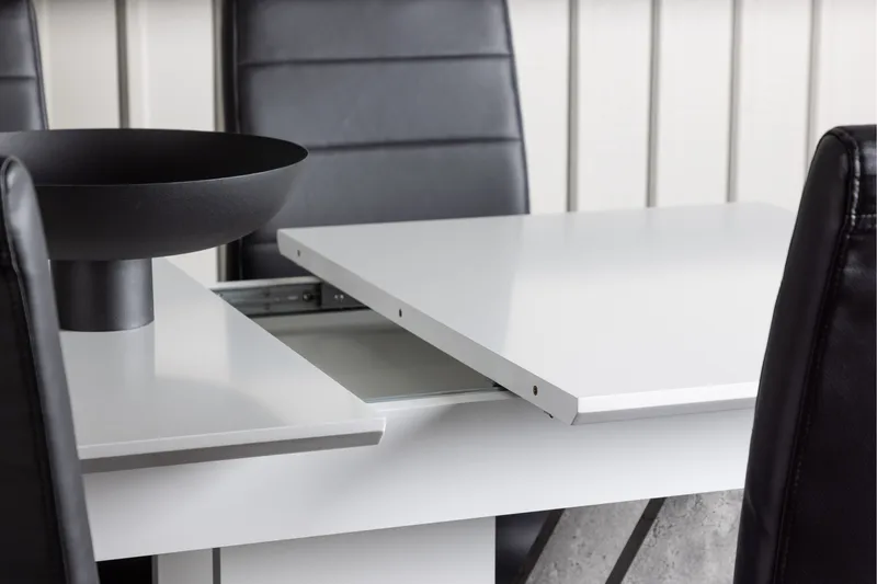 Välkommen till en värld av stilfulla måltider och oslagbar komfort med vår fantastiska Disa matgrupp och Tempo matstolar! Vårt förlängningsbara matbord Disa har en rektangulär bordsskiva i vit MDF och ett stilrent center-placerat underrede i samma material samt två grå MDF-stommar som blir en snygg detalj. Men det bästa av allt är att det är förlängningsbart, vilket gör det idealiskt för både små och stora sällskap. Bordets mått: 120/160x80cm. Här i underbar kombination med våra moderna matstolar Tempo. Stolens trendiga svarta PU-klädsel och kromade stolsben är en kombination av stil och funktionalitet. Den dekorativa stommen ger stolen en unik touch och skapar en behaglig svikt som gör att du kan njuta av ett skönt gung under långa middagar.Med den här matgruppen i personlig stil skapar du en inbjudande atmosfär där dina gäster omedelbart känner sig välkomna. Oavsett om du arrangerar en mysig middag för två eller bjuder in till en festlig tillställning, kommer dessa möbler att göra succé varje gång!