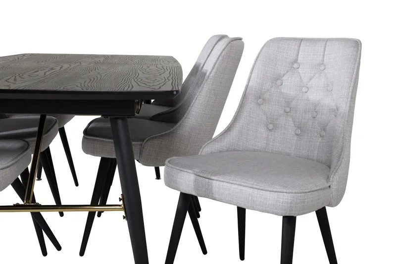 Med en bredd på 85 cm, en höjd på 76 cm och en längd på 180 cm är denna matgrupp perfekt för både vardagsanvändning och större sammankomster. Den svarta färgen ger en elegant touch till ditt matrum och gör det lätt att matcha med andra möbler och inredningsdetaljer.