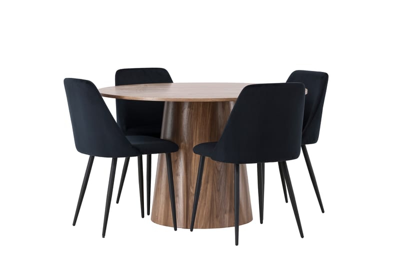 Det träfärgade matbordet Night och de svarta stolarna Night är den perfekta kombinationen för att skapa en inbjudande atmosfär i ditt hem! Med sin skandinaviska design och smakfulla utformning imponerar den här matgruppen på dig och dina gäster omedelbart.Detta runda matbord från serien Night är tillverkat i MDF och har en tunn, rund toppskiva som ger en elegant touch till ditt matrum. Den vridna cylinderformade stommen, som är centrerad under bordets mitt, ger en modern twist till designen. Dess jordnära kulör framhäver dessutom materialets naturliga mönster och ger en harmonisk känsla till rummet. Bordets mått i diameter: 120cm. Tillsammans med detta moderna matbord kommer våra stilrena matstolar Night. Med sin stilrena och bekväma helklädda sits i svart sammetstyg och matchande svarta stolsben, ger dessa matstolar ett lyxigt skimmer till rummet. Sitsen är också stoppad för extra komfort. Denna kombination skapar en inbjudande och modemedveten atmosfär som kommer att få dig att känna dig som en VIP-gäst i ditt eget hem. Upplev komfort och elegans samtidigt!