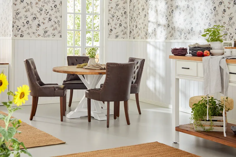 Lyon är ett runt matbord med skiva vintagebehandlat almträ och vitlackat underrede. Bordet har mindre märken som tillför charm till möbeln och ger matbordet en naturlig look med genuin känsla. Lyon matbord är ett hantverk med varierande ådringar och struktur som gör att varje bord blir unikt. Det förekommer färgskillnader, mindre sprickor och ojämnheter som en del av det rustika utseendet.