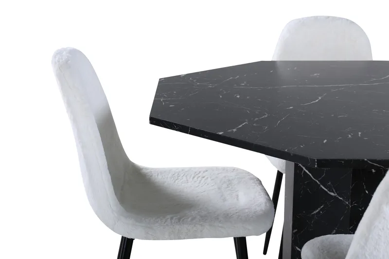 Den klassiska och tidlösa kombinationen av kulörerna svart och vit - lika iögonfallande som stilsäkert! Matbordet Marbs är format som en oktagon och har en helklädd design med en toppskiva i svart marmorglas med spräckligt vitt mönster och bordsben i MDF och marmorpapper. Bordets mått: Diameter: 110cm, Höjd: 75cm. Här i perfekt kombination med 4st Polar matstolar i modern design och mjukt teddytyg. Stolsbenen är lätt utsvängda i svart metall och sitsen i vitt teddytyg - lika bekvämt som trendigt. Stolens mått: Höjd: 87cm, Sitthöjd: 45,5cm, Bredd: 44cm, Djup: 53cm.