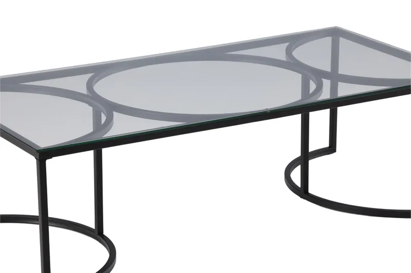 Detta soffbord har en rektangulär form och är tillverkat av högkvalitativt glas. Den svarta färgen ger en modern och elegant touch till din inredning. Benen är tillverkade av stål och är också svarta, vilket ger en enhetlig och stilren look.