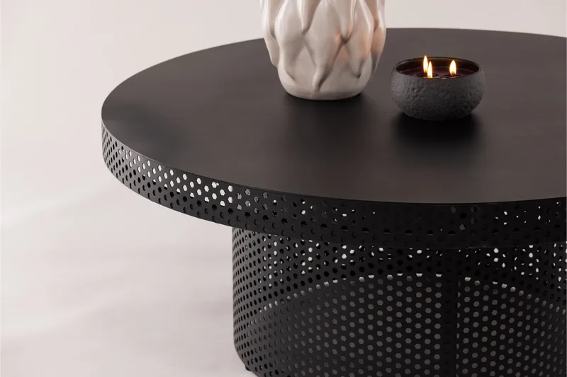 Detta soffbord är tillverkat av stål, både för benen och bordsskivan, vilket ger det en robust och hållbar konstruktion. Den svarta färgen på både benen och bordsskivan ger en enhetlig och stilren look.
