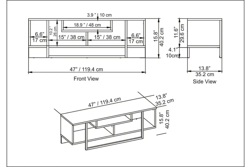Med en bredd på 120 cm och en djup på 35,2 cm erbjuder denna tv-bänk tillräckligt med utrymme för att rymma din tv och andra medieenheter. Bordsskivan är 1,8 cm tjock och kan enkelt hålla upp till 45 kg, vilket gör den både robust och hållbar.