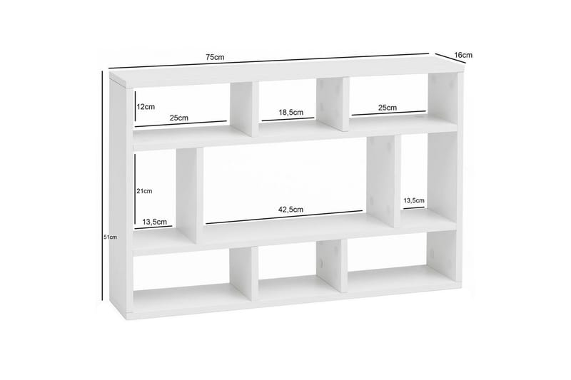 • MÅTT: Bredd: 75 cm // Höjd: 51 cm // Djup: 16 cm // Maximal belastning per fack: 5 kg // De invändiga måtten på de enskilda facken finns i måttritningen.