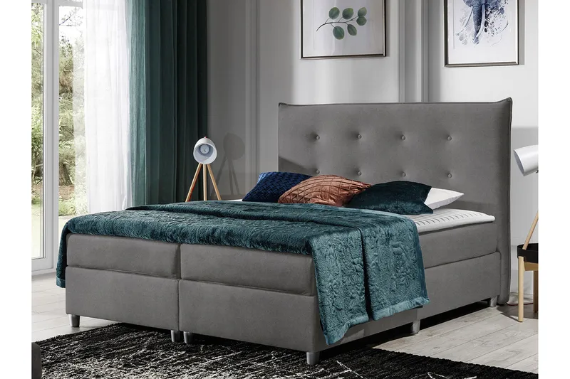 Prato Kontinentalsäng har en stilren och tidlös design som passar perfekt in i alla typer av sovrum. Den är klädd i sammetsliknande grå polyester som ger en exklusiv och elegant känsla. Med sin spånskiva stomme och träben är denna säng även mycket stabil och hållbar.