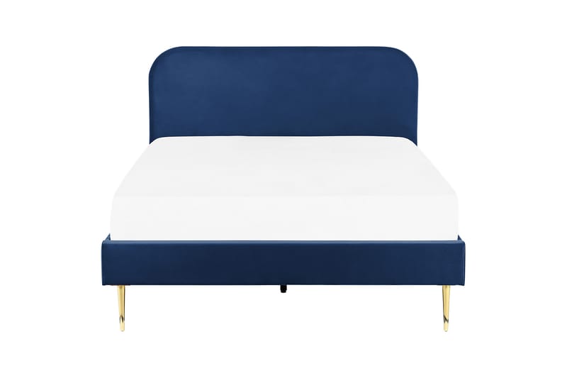 Dubbelsäng i sammet. Uppdatera stilen i ditt sovrum med denna eleganta, minimalistiska säng. Med huvudgavel i vacker marinblå sammet som är både mjukt och bekvämt, men också hållbart. Sängen är ett perfekt komplement till varje sovrum. Sängramen är gjord av massivt trä och säkerställer god, vilsam sömn och korrekt kroppsviktsfördelning. Hela konstruktionen kompletteras av gyllene ben som skapar en glamorös atmosfär och garanterar möbelns stabilitet.