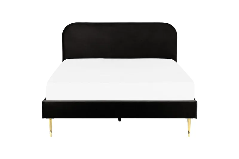 Dubbelsäng i sammet. Uppdatera stilen i ditt sovrum med denna eleganta, minimalistiska säng. Med huvudgavel i vacker svart sammet som är både mjukt och bekvämt, men också hållbart. Sängen är ett perfekt komplement till varje sovrum. Sängramen är gjord av massivt trä och säkerställer god, vilsam sömn och korrekt kroppsviktsfördelning. Hela konstruktionen kompletteras av gyllene ben som skapar en glamorös atmosfär och garanterar möbelns stabilitet.