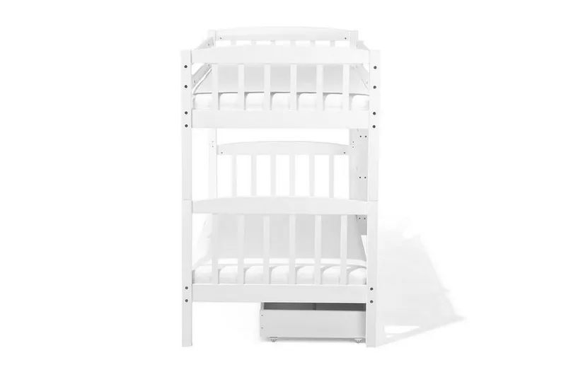 Praktisk och bekväm våningssäng i vit färg. En praktisk hög säng är den perfekta kombinationen av bekväm och inbjudande sovplats för såväl barn som unga vuxna. Sängen är utformad med vertikala skenor på fotgaveln och en sängram av robust furuträ, vilket garanterar både stabilitet och säkerhet. Den är en trendig och platsbesparande lösning för alla moderna sovrum. Den rekommenderade höjden för den översta våningssängsmadrassen är mindre än 13 cm så att skenorna garanterar maximal säkerhet.