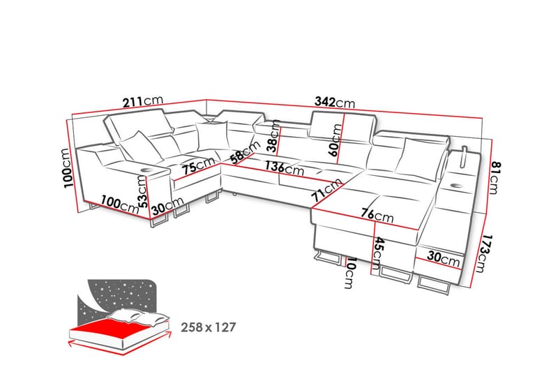 Denna eleganta hörnbäddsoffa i svart kommer att bli en perfekt komplettering till ditt vardagsrum. Med sin U-formade design och generösa storlek på 342 cm i bredd, erbjuder den gott om plats för hela familjen att koppla av och njuta av gemenskapen.