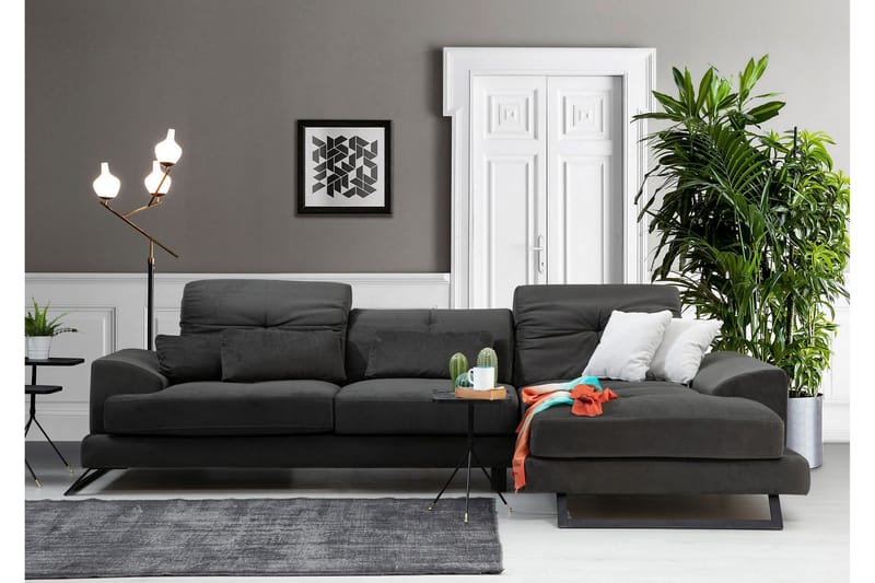 Med sin svarta färg och metallben ger denna hörnsoffa en stilren och elegant känsla till ditt hem. Den är också lätt att matcha med olika inredningsstilar och färger.