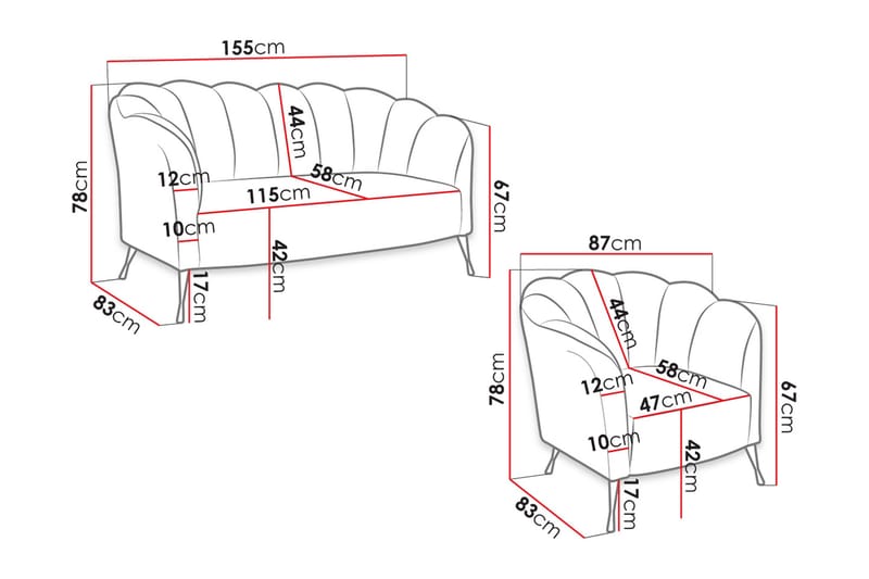 Med sina generösa dimensioner - 155 cm i bredd, 78 cm i höjd och 83 cm i djup - erbjuder denna soffgrupp gott om plats för tre personer att sitta bekvämt. Sittdjupet är 58 cm och sitthöjden är 42 cm.
