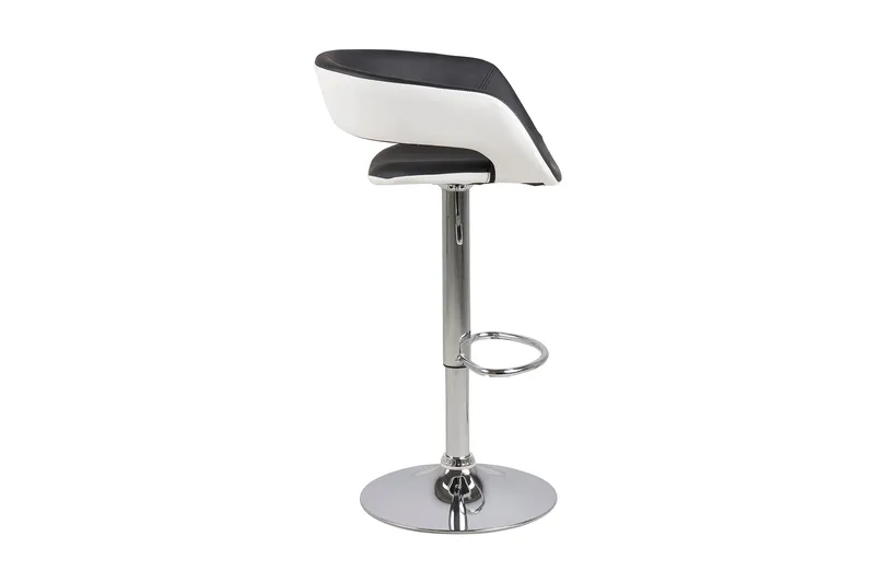 Denna barstol har en vit färg med svarta detaljer som ger den en snygg kontrast. Den är tillverkad av metall och klädd i PU-material, vilket ger den en lyxig och lättstädad yta.
