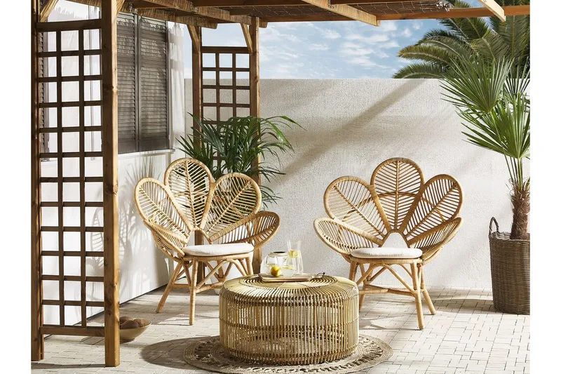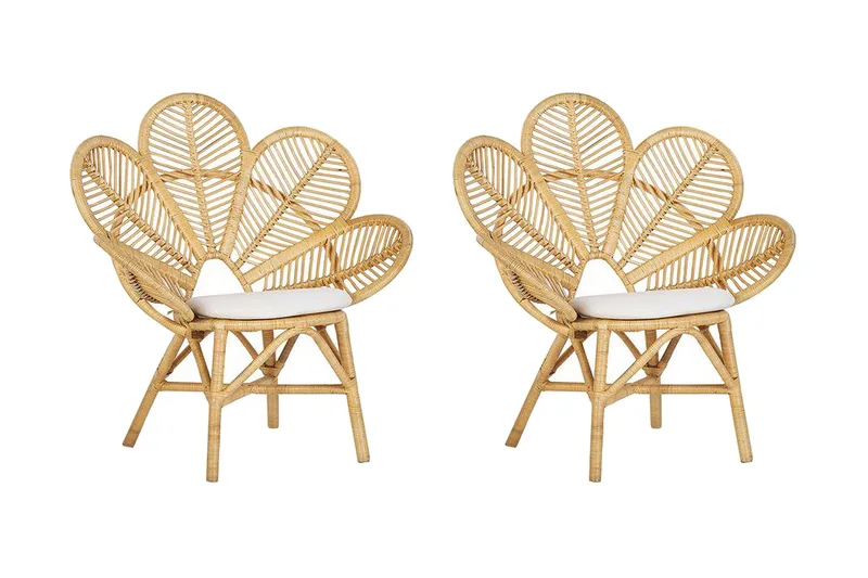 Fåtöljer i påfågel-stil av rotting. En universell uppsättning stolar i en trendig påfågeldesign är ett utmärkt val för alla utomhus- eller inomhusutrymmen. Stolarna är helt tillverkade av rotting och är extremt lätta och enkla att flytta från en plats till en annan. De är utrustade med sittdynor i bomull för ökad komfort och extra stil. Setet passar bäst i bohemiska och rustika miljöer.