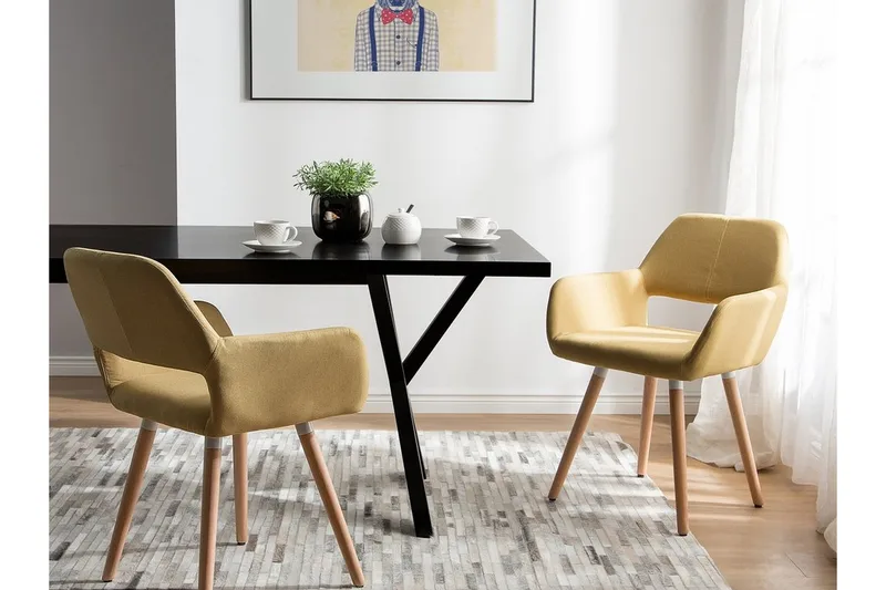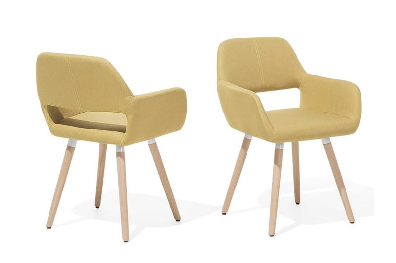 Två moderna matsalsstolar i retrostil. Ge din matsal eller ditt kök en fräsch touch med denna moderna retrostol. Den geometriska formen och de höga, lutande benen påminner om klassisk 60-talsdesign. Den högkvalitativa ljusgula klädseln är behaglig att ta på och håller för många års användning. Tack vare den djupa sitsen och det vadderade ryggstödet är stolen både bekväm och inbjudande. Kombinera den med ett minimalistiskt bord för att skapa ett elegant blickfång i ditt hem.