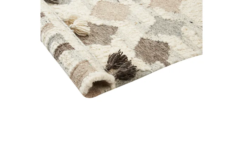 Handgjord rektangulär matta med tofsar. Dekorera golvet i vardagsrummet, sovrummet eller andra vardagliga utrymmen med denna matta för att skapa en varm boho-stämning i rummet. Denna kelim är handvävd av bomull och ull och kommer att hålla i många år, även utan dagligt underhåll. Förutom att den är lättskött är den också mycket behaglig att ta på. På ytan har mattan ett geometriskt mönster i olika nyanser av beige och brunt, medan dess ändar är dekorerade med matchande tofsar.