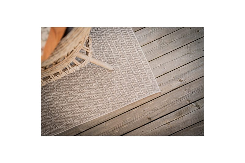 Den kraftiga flatväven i naturliga färger ger känslan av en tidlös sisallook. Tankarna går till utemiljöer eller uterum men mattan är lika fin inomhus, placerad där det krävs något extra tåligt. Mattan har tydliga strukturer och mönstret är klassiskt modernt i en sparsmakad geometrisk design. Känslan av struktur förhöjs ytterligare genom samspelet mellan garner av olika nyanser ton-i-ton. Tillverkad av 100% extra hållbart polypropylengarn. Garnet är UV-beständigt, tål vatten, fäller inte, och är fläckavvisande. Mattan kan därför utan problem placeras utomhus, i uterum eller inomhus. Kanterna är avslutade med tålig langett i matchande färg. Mattan är lätt att göra ren - dammsug eller spola av med ljummet vatten och låt torka. Fläckar avlägsnas med en svamp, lite ljummet vatten och diskmedel.