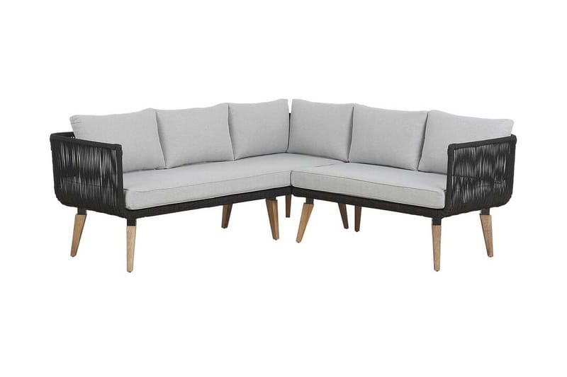 Elegant trädgårdsmöbelset i modern stil. Slappna av bekvämt i din trädgård med denna sektionssoffa. Den universella, moderna designen gör den till ett perfekt tillskott till alla moderna, traditionella och minimalistiska utomhusmiljöer. Sitsen, armstöden och ryggstödet har vävda rep, vilket tillsammans med generöst vadderade sitt- och ryggkuddar ger högsta komfort. Setet levereras komplett med ett träbord i en naturlig, ljus träfinish som ger setet en rustik touch.