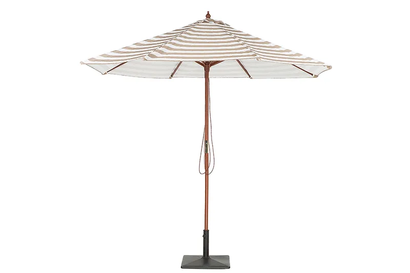 Parasoll i beige/vitt. Med detta parasoll kan du skapa en elegant, skuggig tillflyktsort på balkongen eller i trädgården, perfekt att svalka sig med under varma sommardagar. Parasollet har en stadig stång i björkträ och en skärm i polyester som är uppspänd på åtta träribbor. Det randiga mönstret på baldakinen ger en cool retrocharm till alla utomhusmiljöer. Parasollet öppnas och stängs enkelt med en snörmekanism.