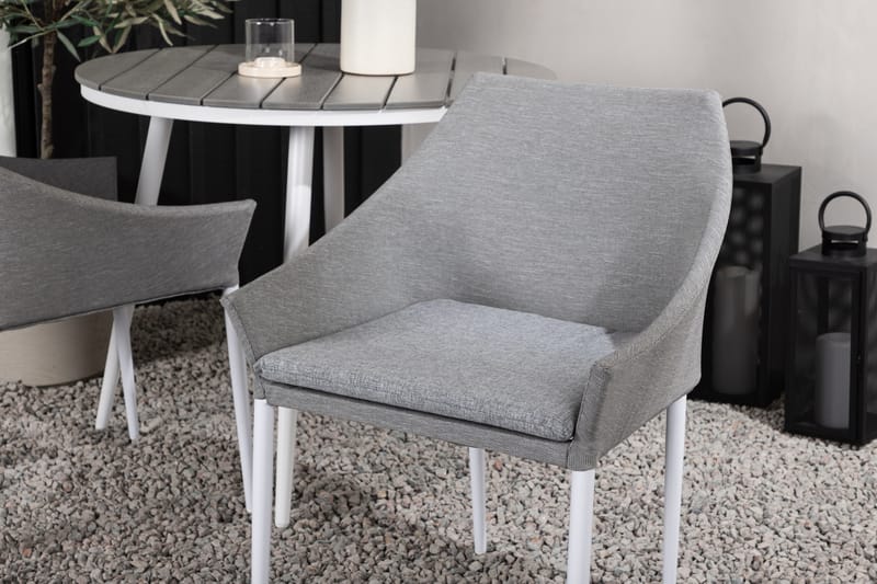 Skapa den perfekta fikaplatsen på din altan i sommar! Här kombineras tidlös design med inbjudande former i ett nätt blickfång. Matbord Break har en grå bordsskiva i grå aintwood och ett klassiskt underrede i vit aluminium. Stolarna är från serien Spoga, en stol med fokus på stil och komfort. Den inbjudande sitsen är lätt rundad i grått tyg och benen är i vitt stål. Duka ut frukosten eller kvällsfikan och njut av somriga dagar!