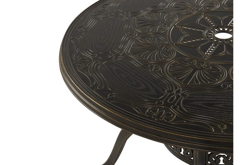 Praktiskt utemöbelgrupp i retro-stil. Ge din uteplats ett lyft med den här vintage-inspirerade matgruppen för utomhusbruk. Satsen är lätt men hållbar tack vare aluminiumkonstruktionen och innehåller ett runt bord och fyra stolar. Den har vackra, kurviga linjer, intrikata mönster och brun finish som ger den ett unikt, sofistikerat utseende. Dessutom ingår fyra sittdynor fyllda med lättviktsskum som ger fullkomlig komfort.